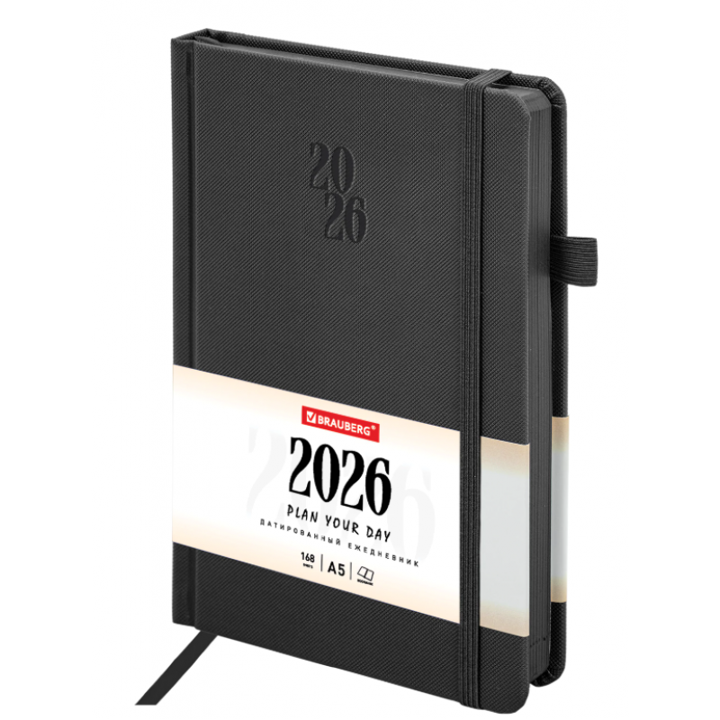 Ежедневник датированный 2026, А5, 138х213 мм, BRAUBERG "Plain", под кожу, резинка, держатель для ручки, черный