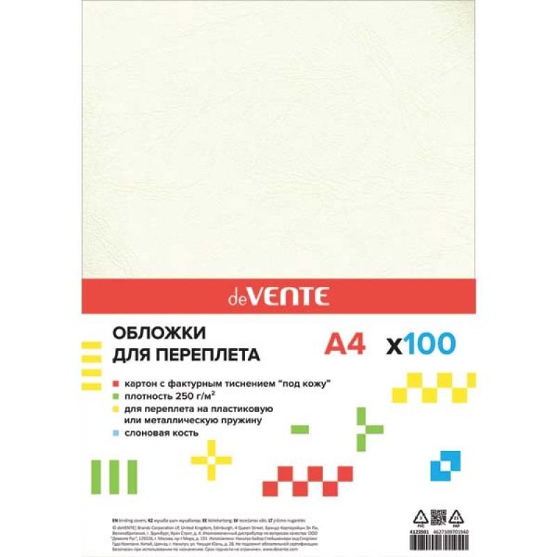 ОБЛОЖКИ ДЛЯ ПЕРЕПЛЁТА А4 КАРТОН ПОД КОЖУ СЛОНОВАЯ КОСТЬ (100ШТ) DEVENTE